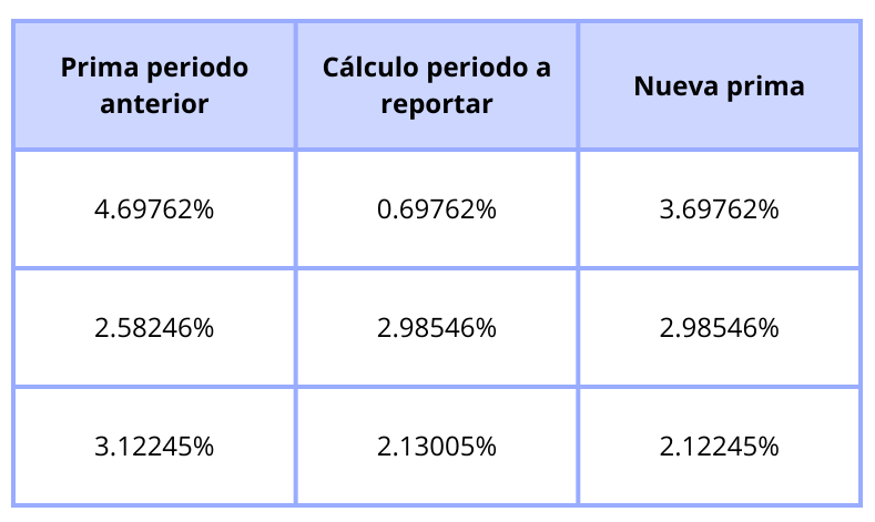 Una vez obtenido el resultado, se debe comparar la prima obtenida del nuevo periodo con la prima del periodo anterior. Si la diferencia entre resultados es menor a una unidad, se mantiene el resultado obtenido. Si la diferencia es mayor a una unidad, el resultado que se empleará es del valor anterior más menos una unidad.